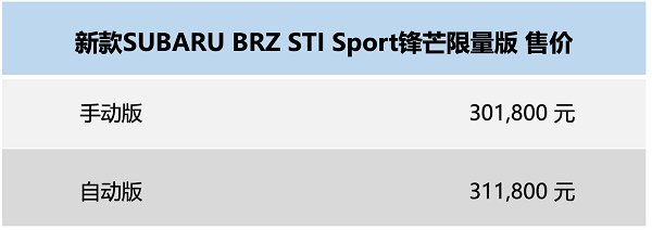 10月15日,新款SUBARU BRZ STI Sport锋芒限量版在中国市场正式发布。该系列将推出手动版和自动版两个版本,新车使用了特别的内饰外观,以100台限量销售的形式全新登场。手动版售价30.18万元,自动版售价31.18万元。新车预计10月末开始陆续交付。